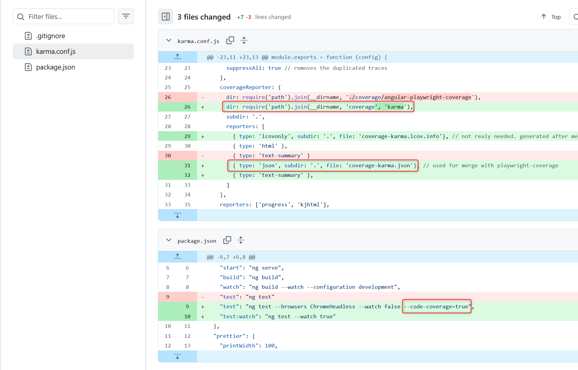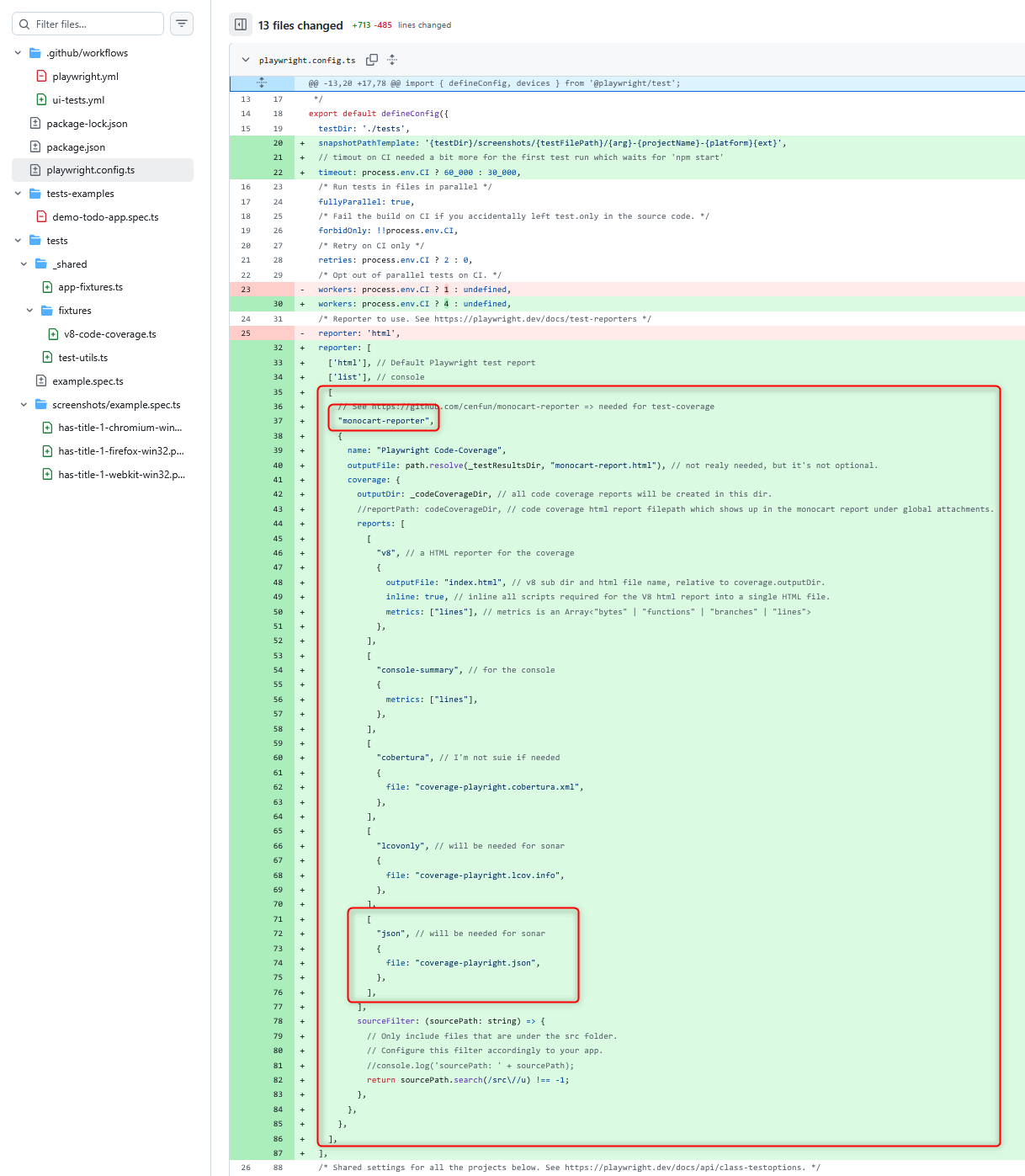 In the Playwright config, the most important thing is to add the monocart-reporter. For merging the coverage data with Karma coverage, you need the ‘json’ reporter.